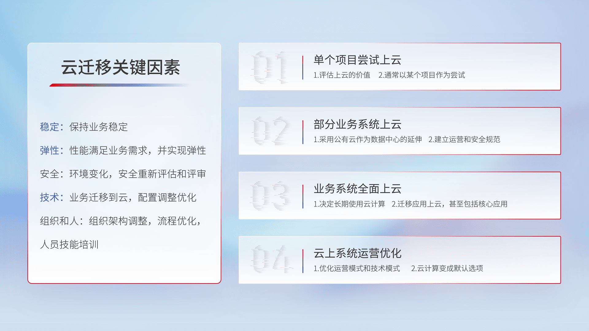 结合实际业务,,从规划设计、、云平台选型、、云原生改造、、数据迁移、、、、集成交付,,,,迁移全过程为客户识别最佳上云路径,,,,做好风险识别管理,,设计网络架构、、身份权限、、、、安全审计合规、、、操作审计、、、日志审计、、、监控告警策略、、、、多站点容灾设计等,,对云上基础设施进行整体规划,,,,提升IT治理水平,,,,以满足弹性、、高可用、、高性能的需求。。。。