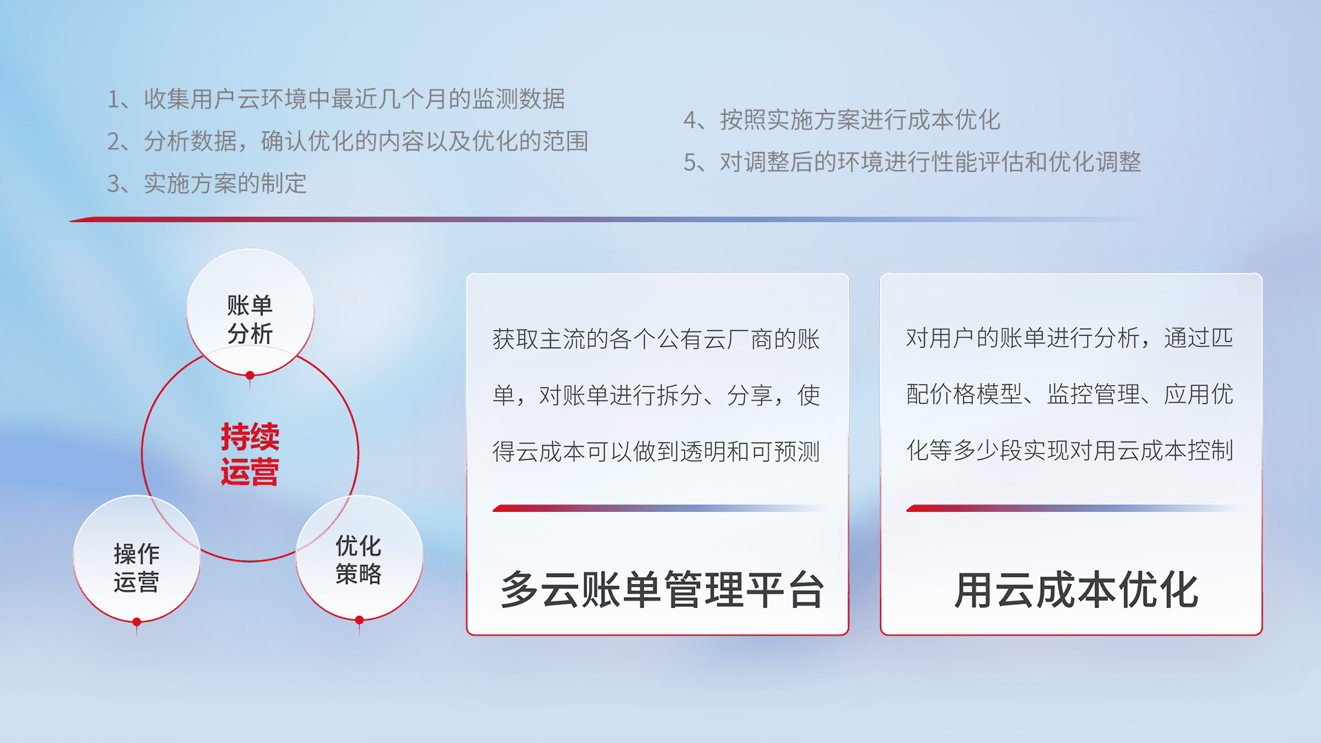 通过多云纳管,,,,以统一的资源数据模型把客户的云资源进行抽象和封装,,,进而实现对多云资源的统一操作,,,保障云资源管理的可靠性、、稳定性与可用性。。。量身定制化运维内容,,,配置、、开发运维、、补丁管理、、、、备份、、监控、、认证和访问管理、、审计和日常巡检等,,,保障在用云过程中的可靠度,,,稳定度以及高可用率。。。。