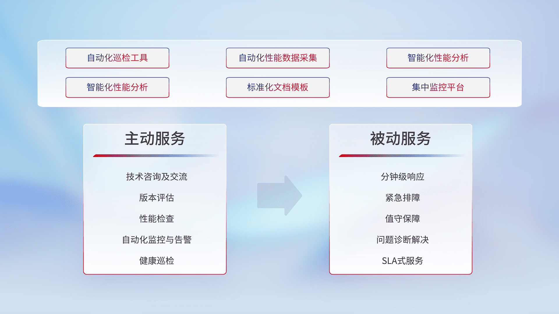 智能化工具和标准化文档,,,,保障服务质量,,,,提供主动服务(包含技术咨询、、、版本评估、、、性能检查、、自动化监控与告警、、、健康巡检)和被动服务包含(分钟级响应、、、、紧急排障、、值守保障、、问题诊断解决、、SLA服务)。。